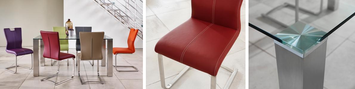 Minimalist design meets urban cool in this contemporary dining set. Statement steel legs, a space-opening glass tabletop and on-trend faux-leather chairs.